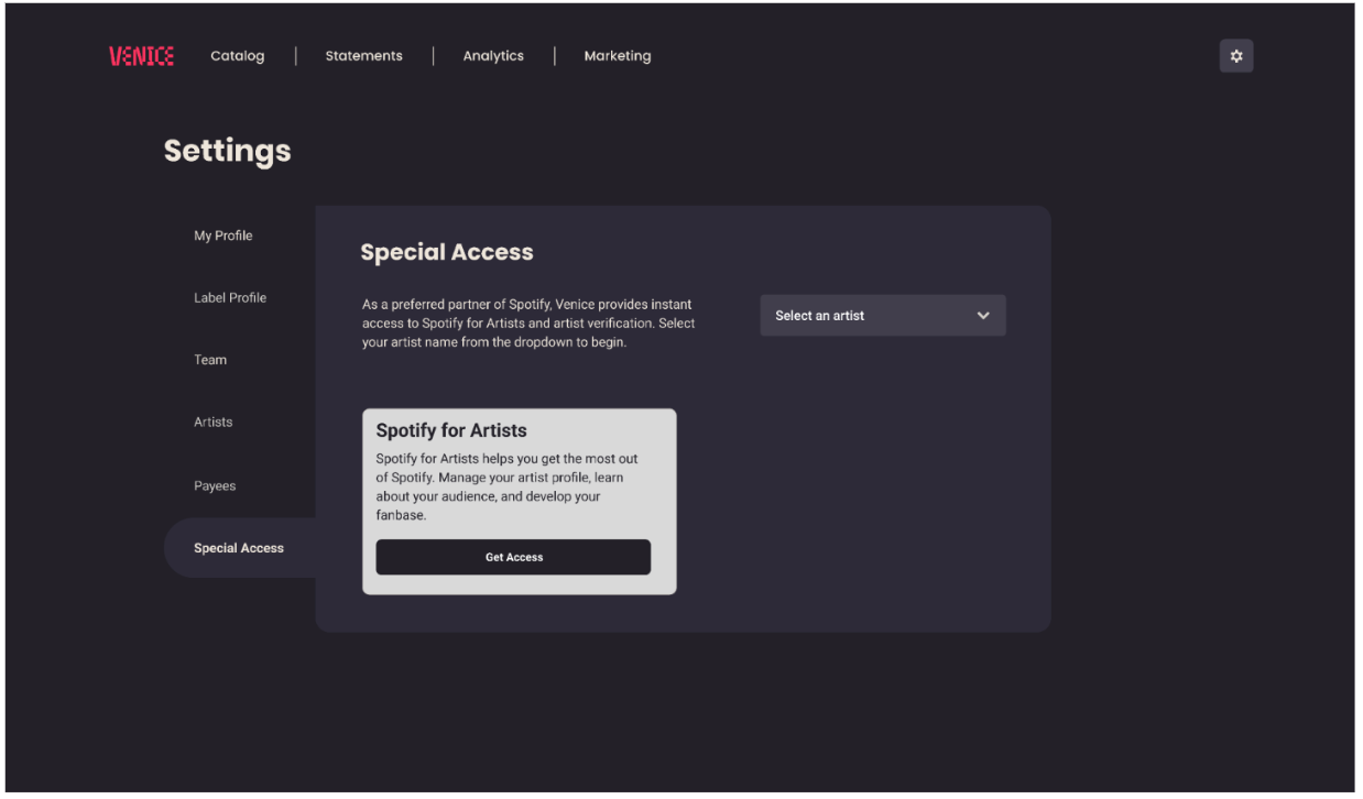 Easily get verified on Spotify through Venice with Spotify for Artists Instant Access! Spotify for Artists is designed to help verified artists and their teams get the most out of Spotify. With Venice, you can get Instant Access to the Spotify for Artists platform features and also receive the blue verification check mark next to the artist profile with ease.