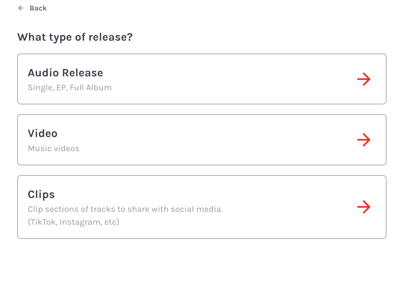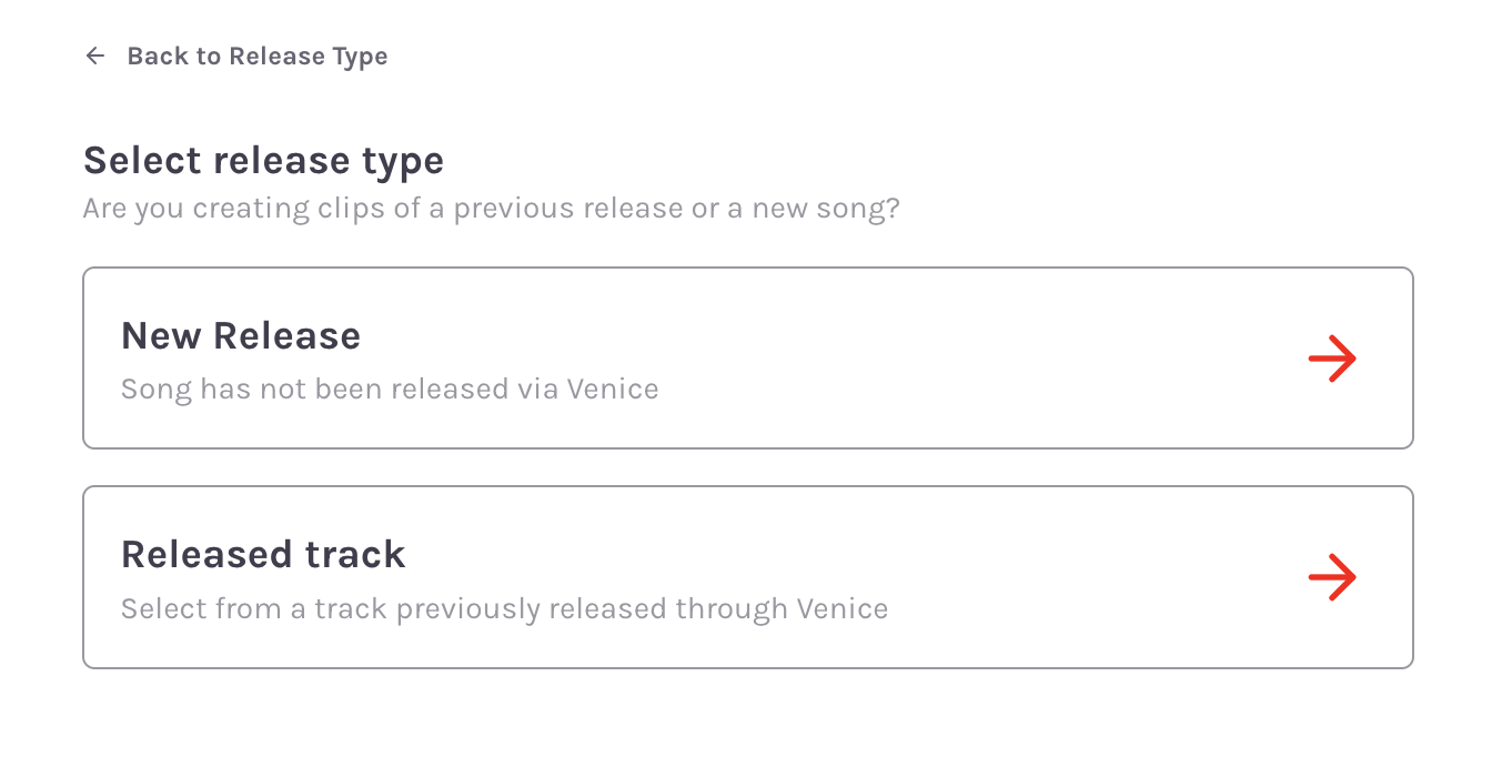 To create a clip release, select + Create Release and the select the Clips option which will bring you to the Clips Create Release flow.