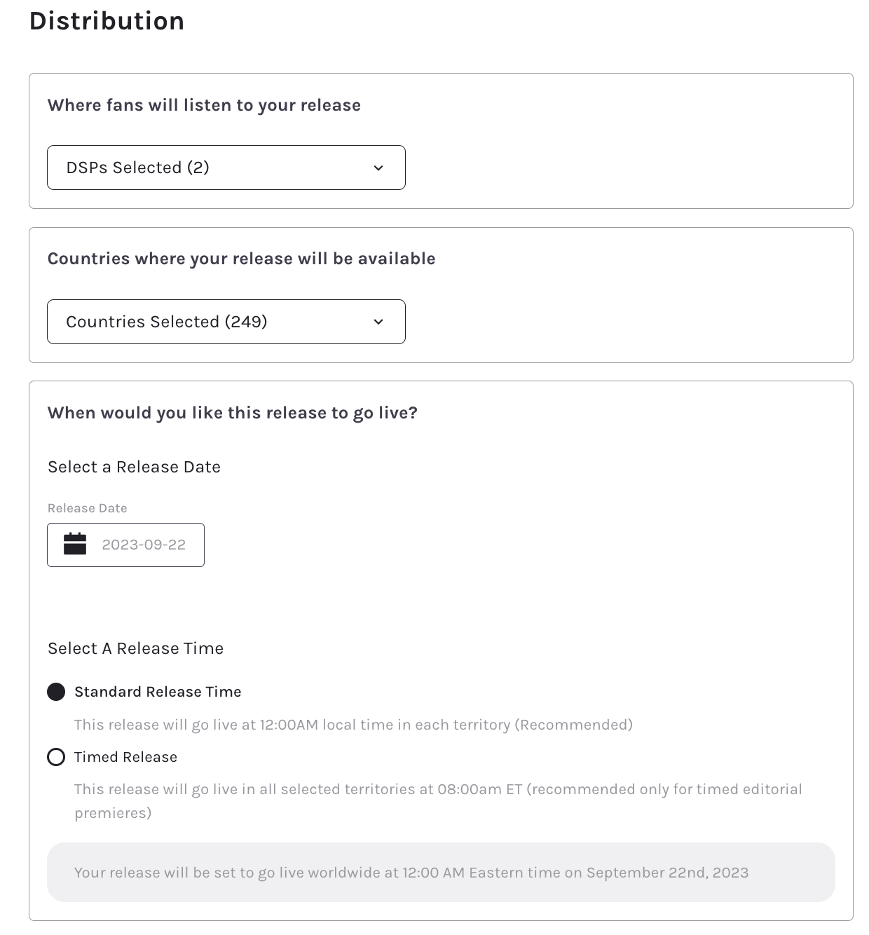 Release Date / Time - Select the date and time the release will be made available on music platforms