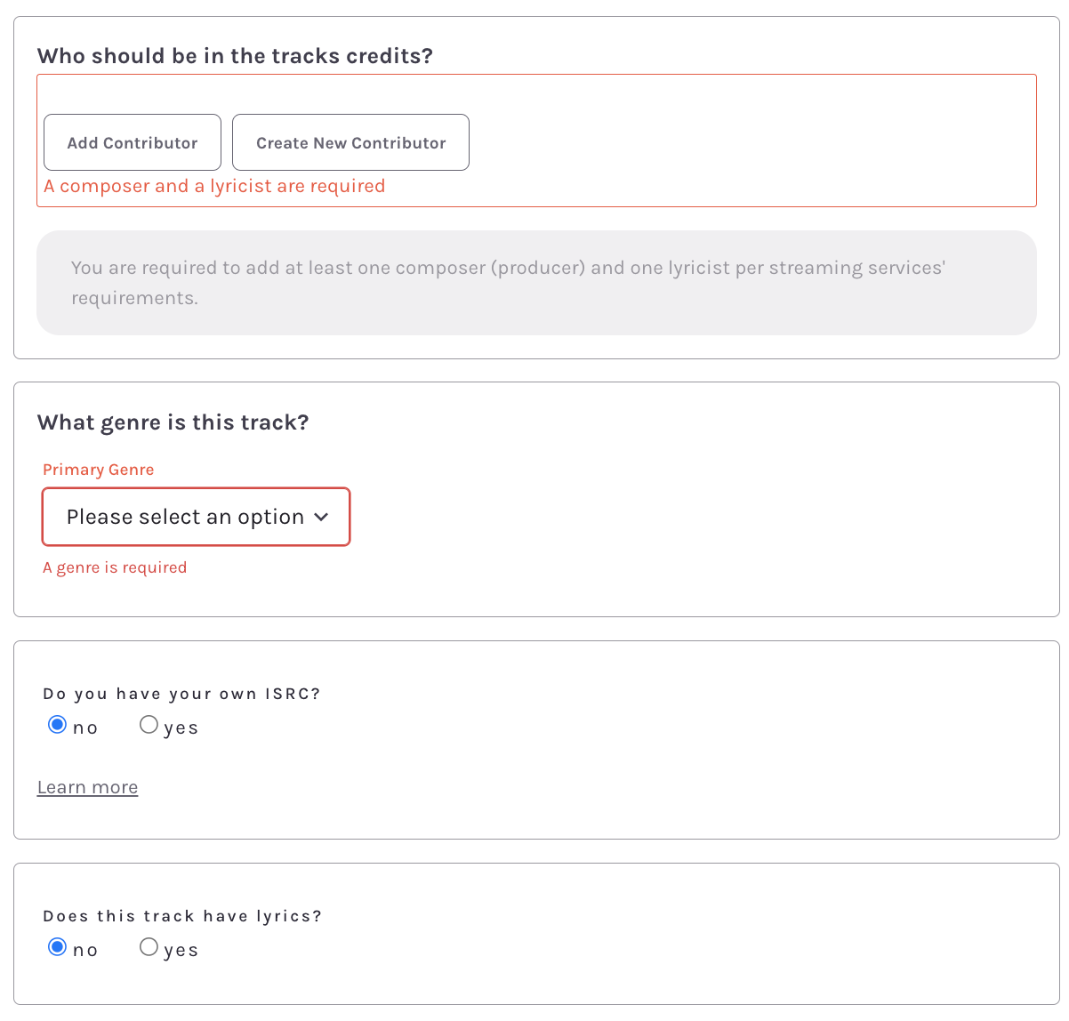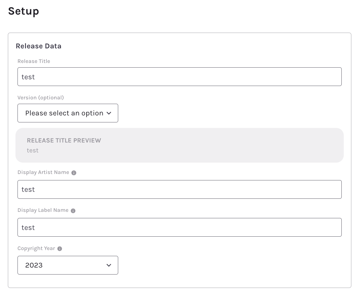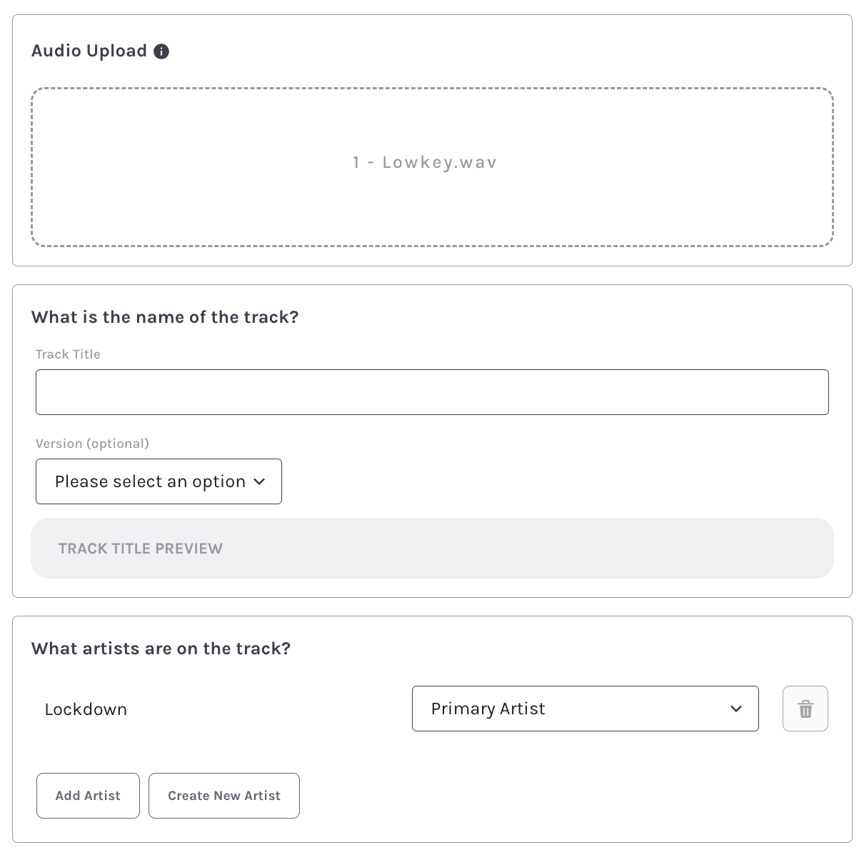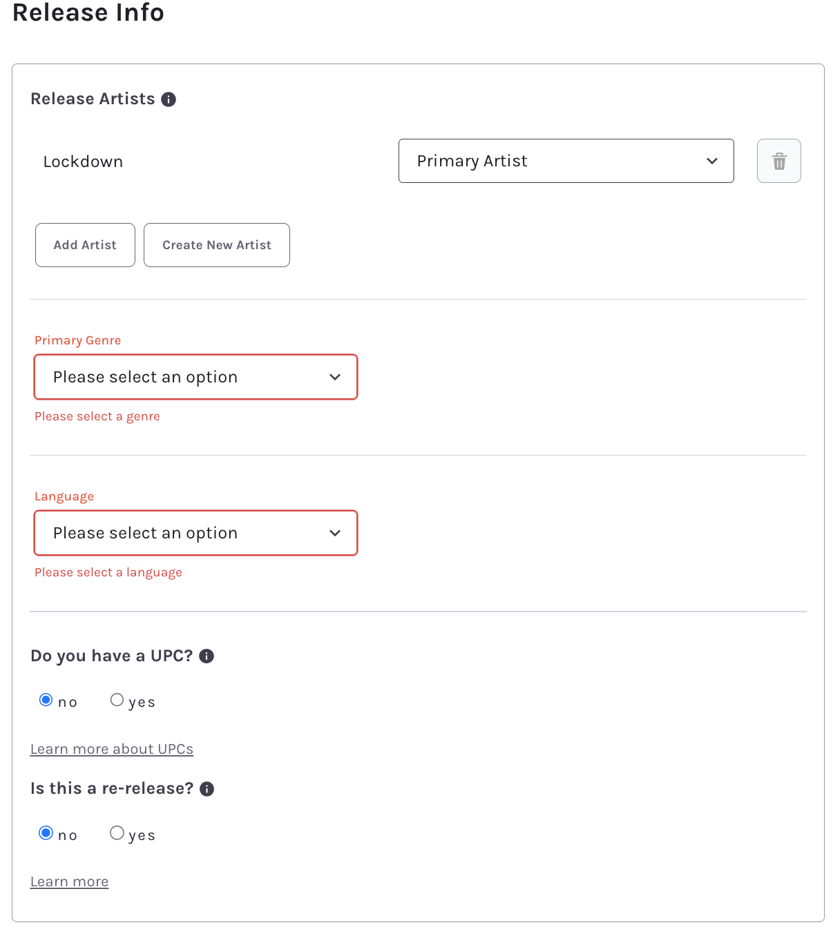 If this audio release has been published before, please do not continue with this create release flow. Utilize to the Venice Catalog Migration support article here for instruction on how to successfully migrate your release and clip. Feel free to reach out to Venice Customer Support here for additional guidance.